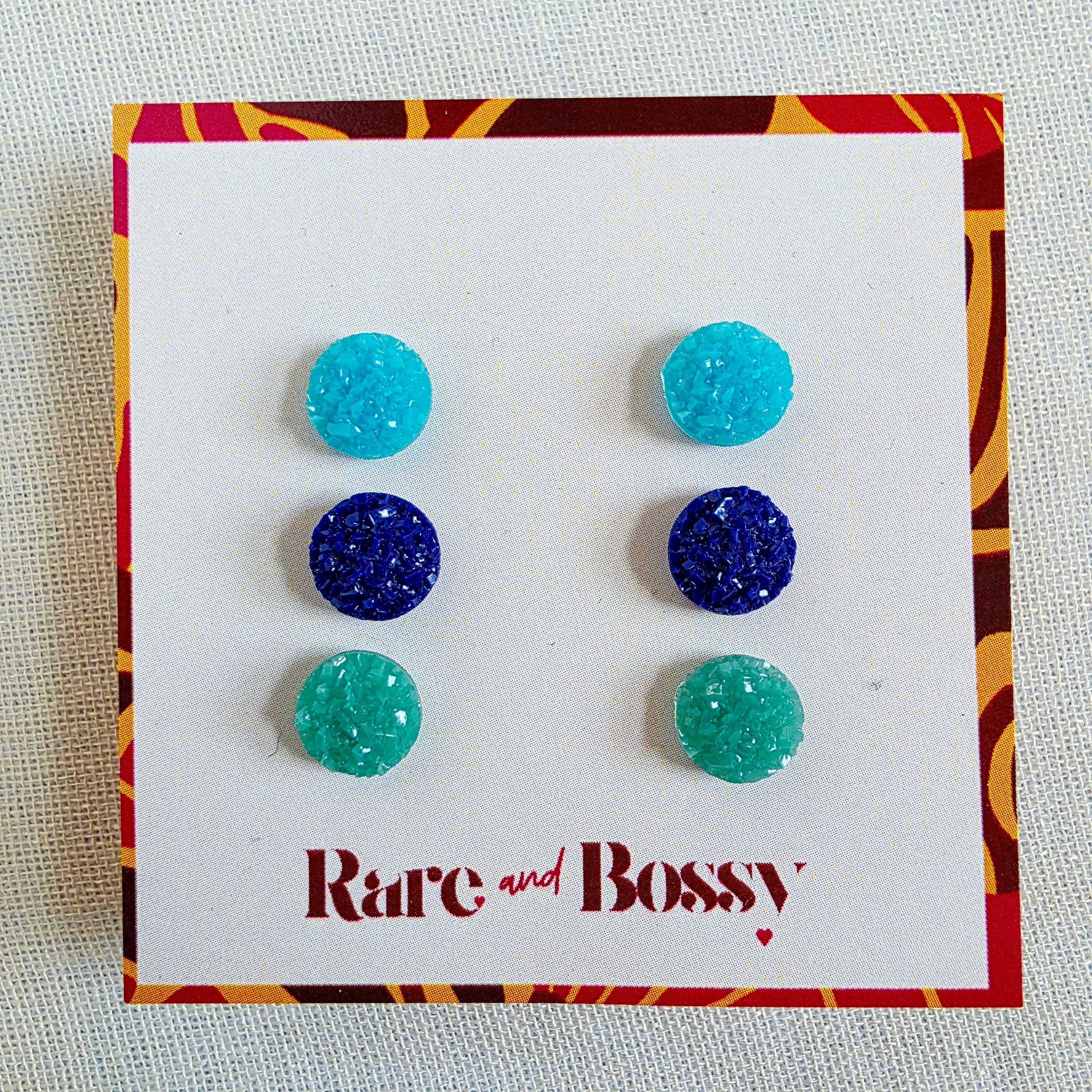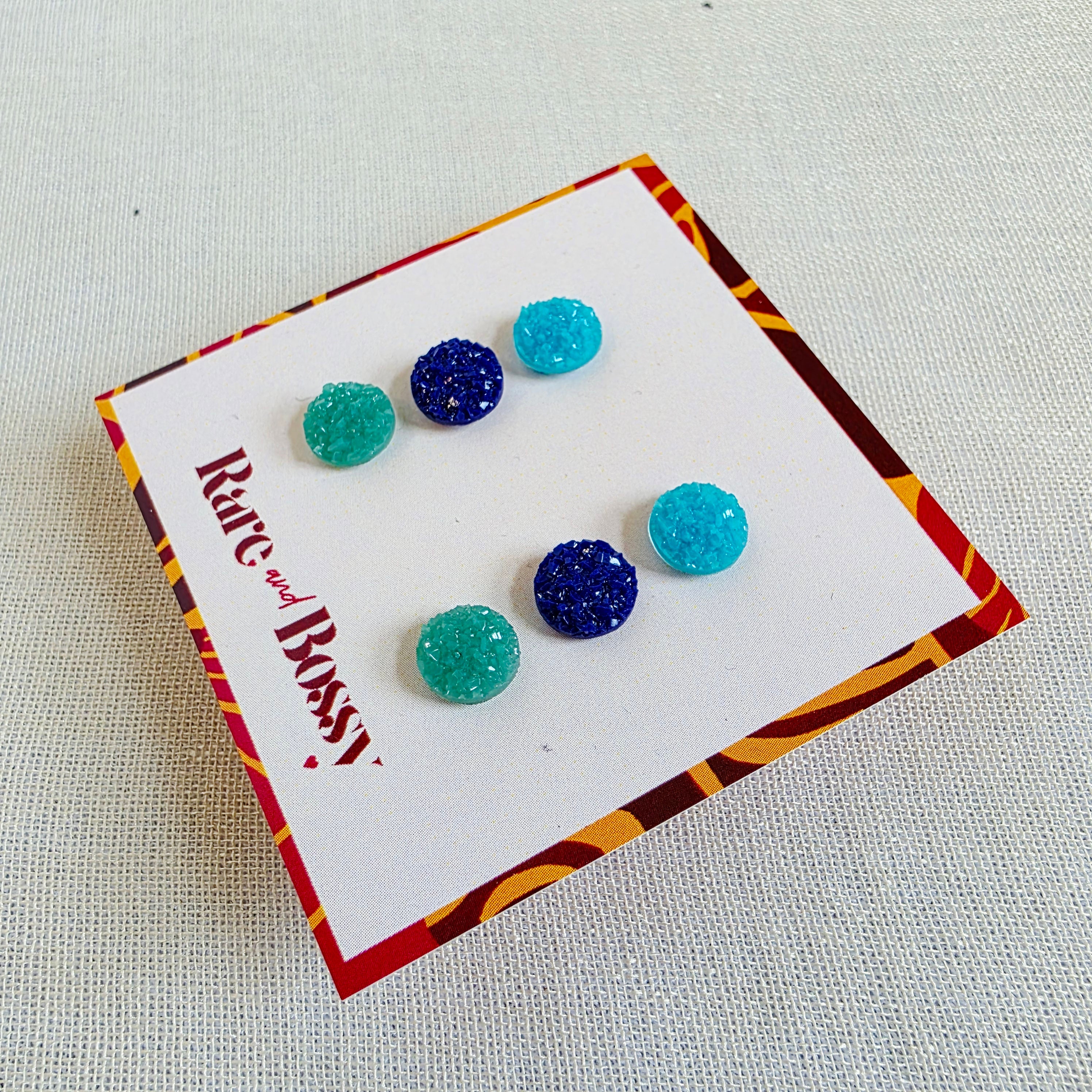 Add a little sparkle to your everyday style with these Light Blue, Dark Blue and Green Mini Druzy Studs. Featuring a textured druzy-style surface, these studs catch the light beautifully with vibrant shimmer and color.