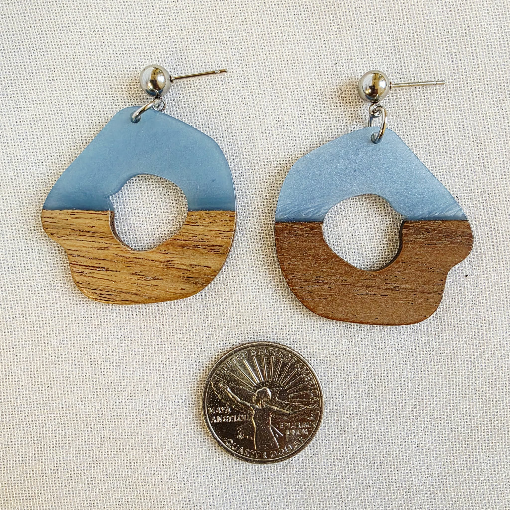 Make a bold statement with these Blue Cutout Wood Resin Dangles. This handcrafted design combines soft blue resin with natural wood, creating a beautiful contrast between cool color and organic texture.