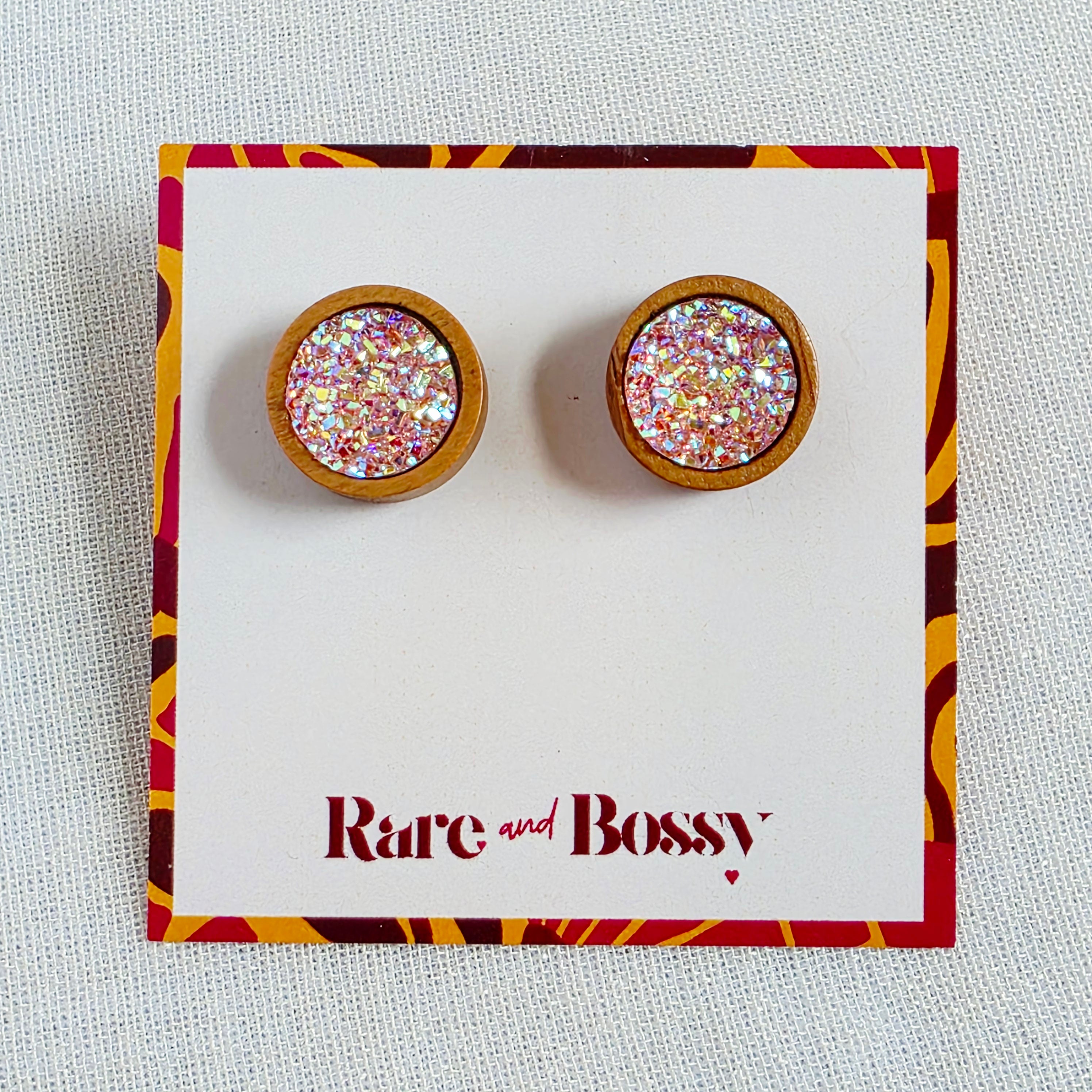 Crafted from resin with a druzy-inspired finish, the circular shape keeps it classic while the blush pink shimmer makes it unforgettable.