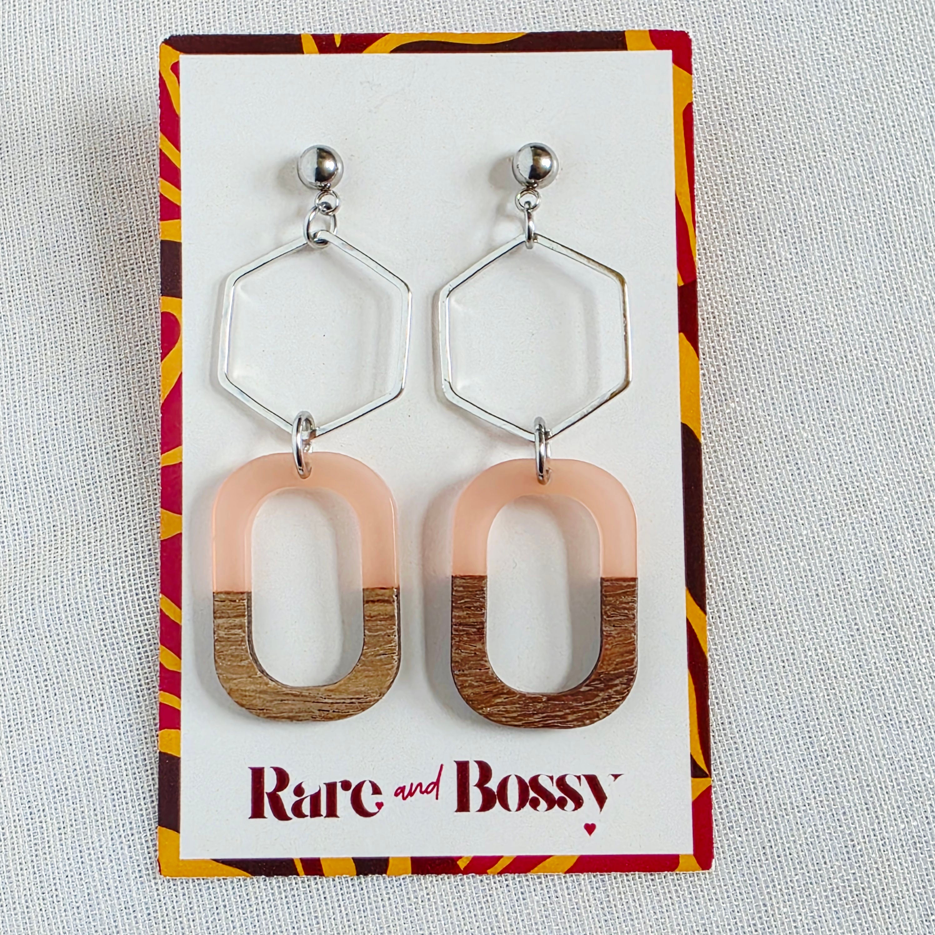 Soft color and clean geometry come together in these Blush Pink Hexagon Dangles. Featuring a gold-tone hexagon stud paired with an open oval wood and resin drop, this design balances warmth, movement, and modern structure for easy statement wear.