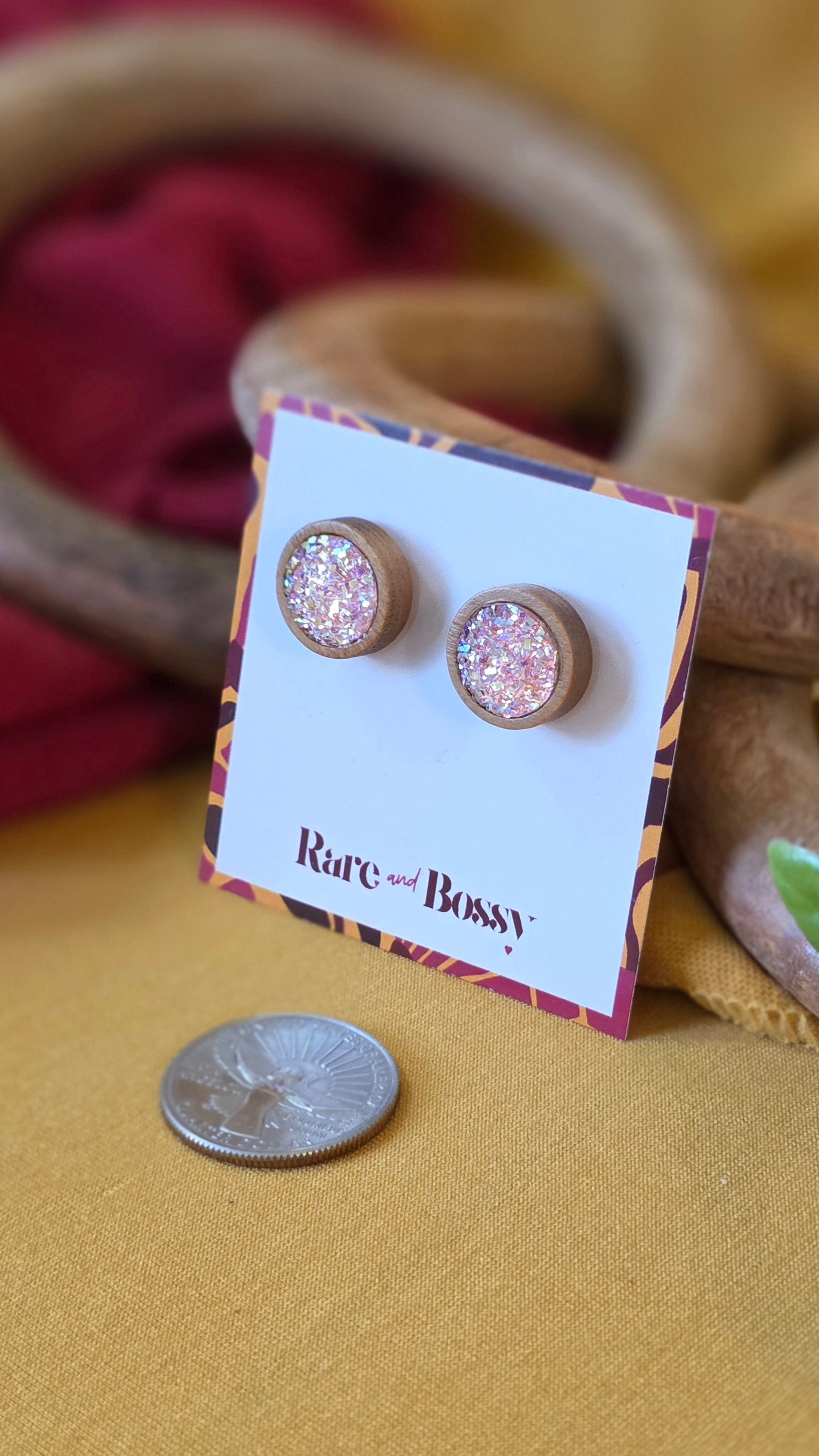 Put the sparkle back in your wardrobe with these dazzling Druzy Studs! Made with a wooden casing, filled with glitter-infused resin, these lightweight round studs will glimmer in multiple colors, while secured by a hypoallergenic stainless steel post, in silver. Ready to light up your outfit? Add some Druzy Studs and you'll be turning heads in no time!