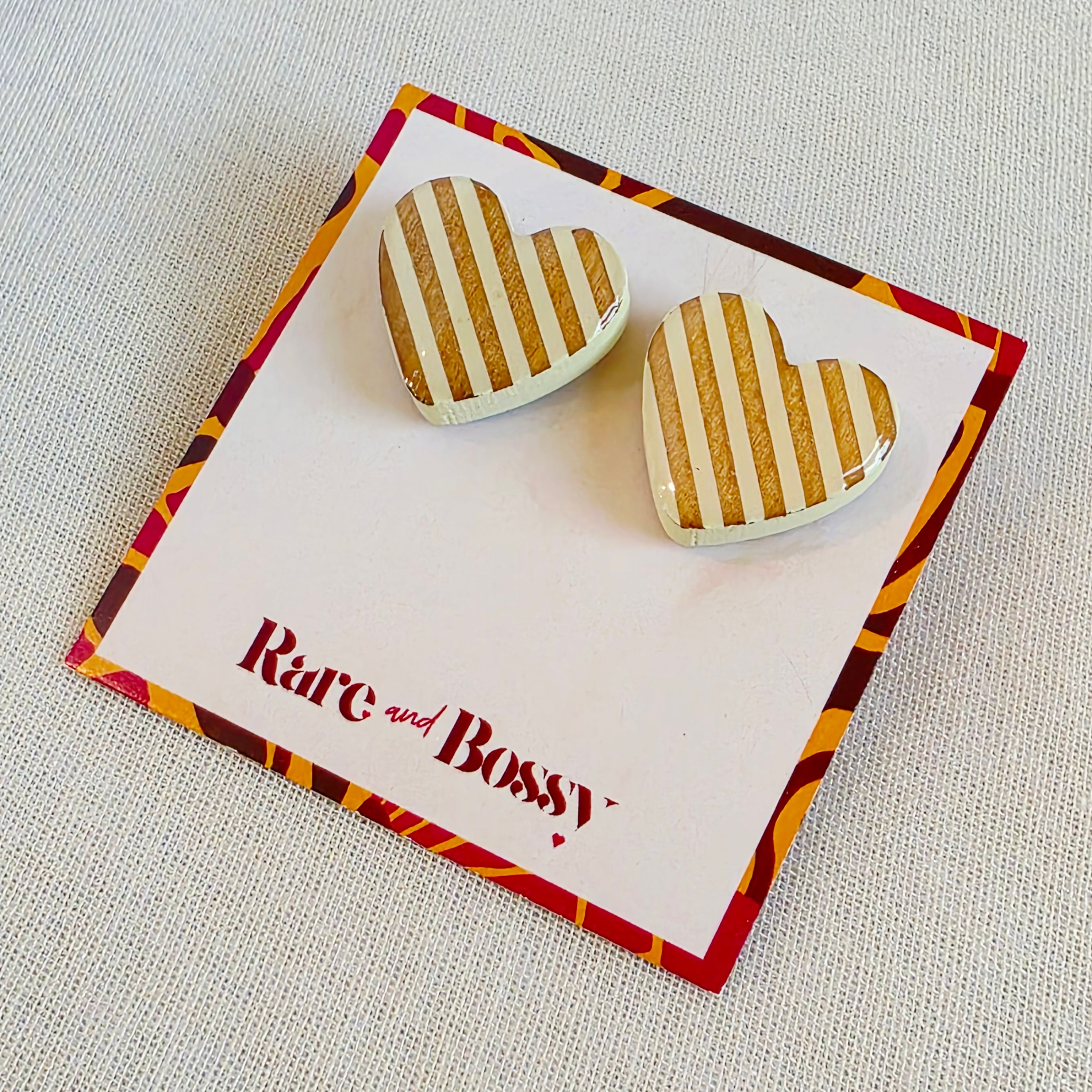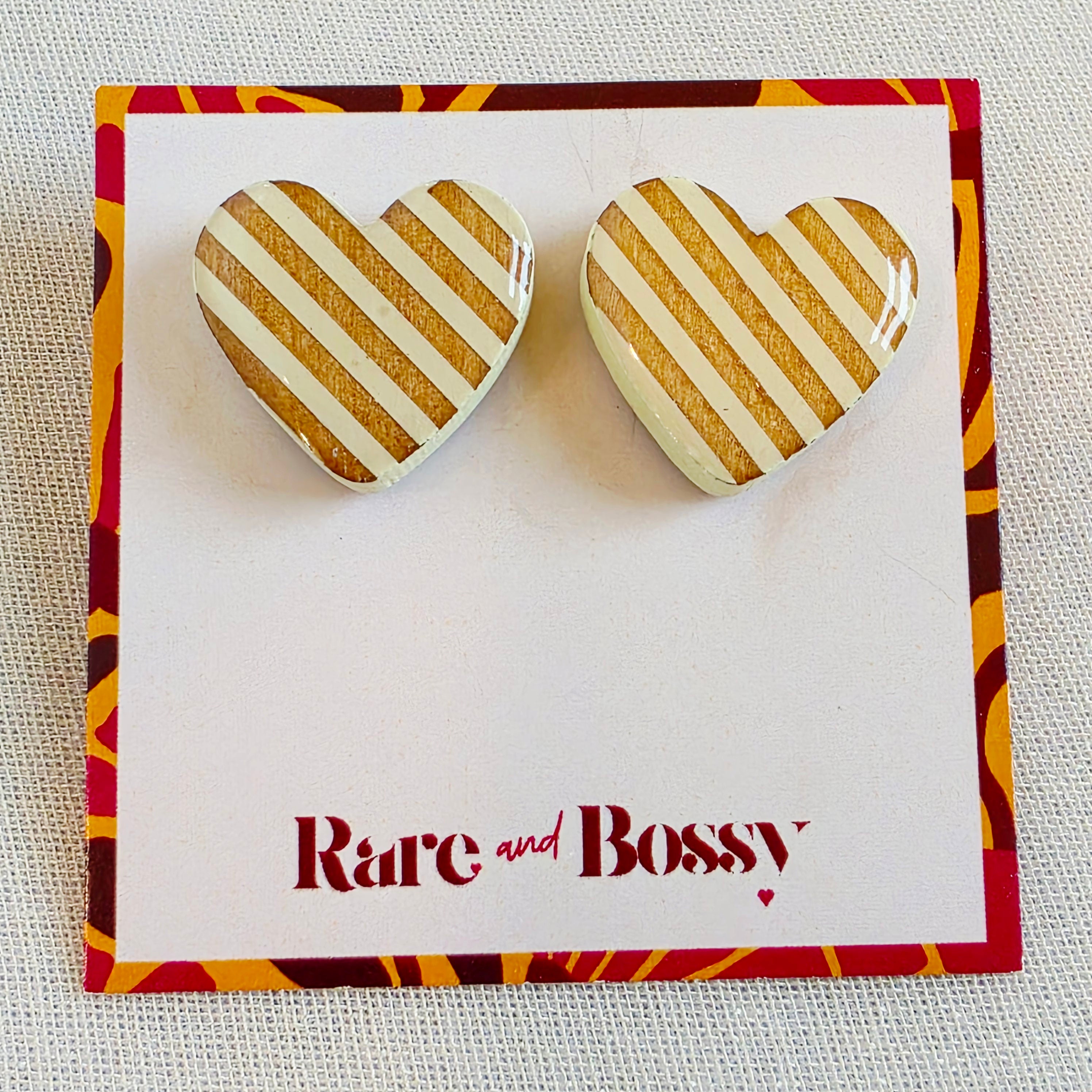 Clean lines meet a classic shape in these White Heart Studs. Featuring a striped resin heart design in soft white and cream tones, this pair offers a polished look that feels elevated yet easy to wear for everyday styling.
