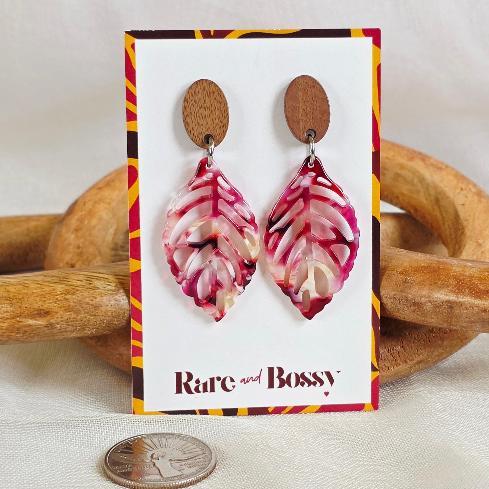Organic shape meets rich color in this statement dangle design. Featuring a carved resin leaf paired with a natural wood stud, this piece brings bold detail while remaining lightweight and easy to wear. Designed for comfortable movement and everyday impact.