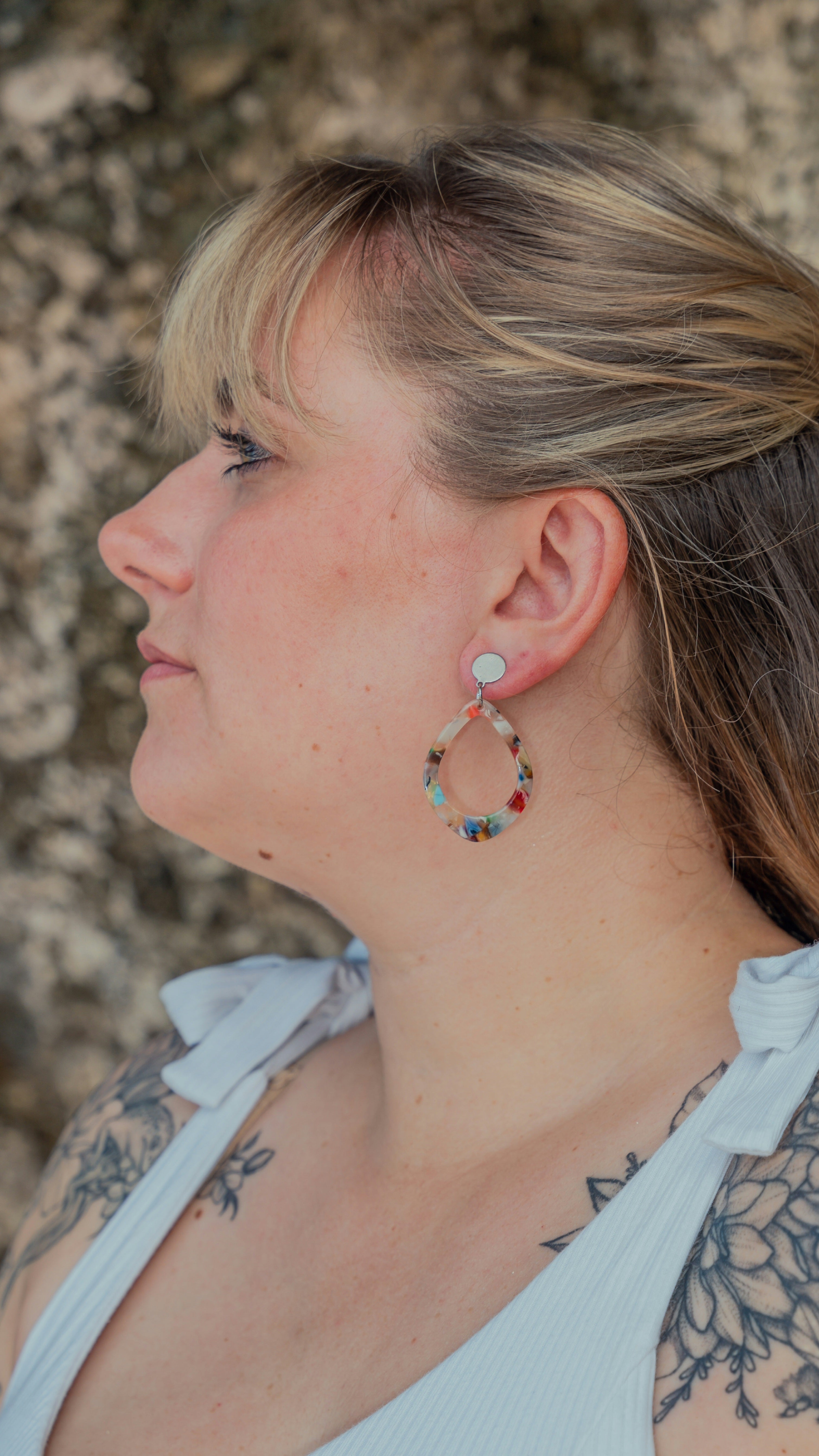 Introducing our Bella Sassy Girl Dangles - a stunning representation of love, beauty, and sass. These earrings feature a large hallow teardrop with a wide bottom bell shape with a vibrant color palette of pinks, white, cream, red, purple, green, and blue, all crafted with high-quality resin. With options of a golden or silver stainless steel round stud post, these earrings offer versatility and style.
