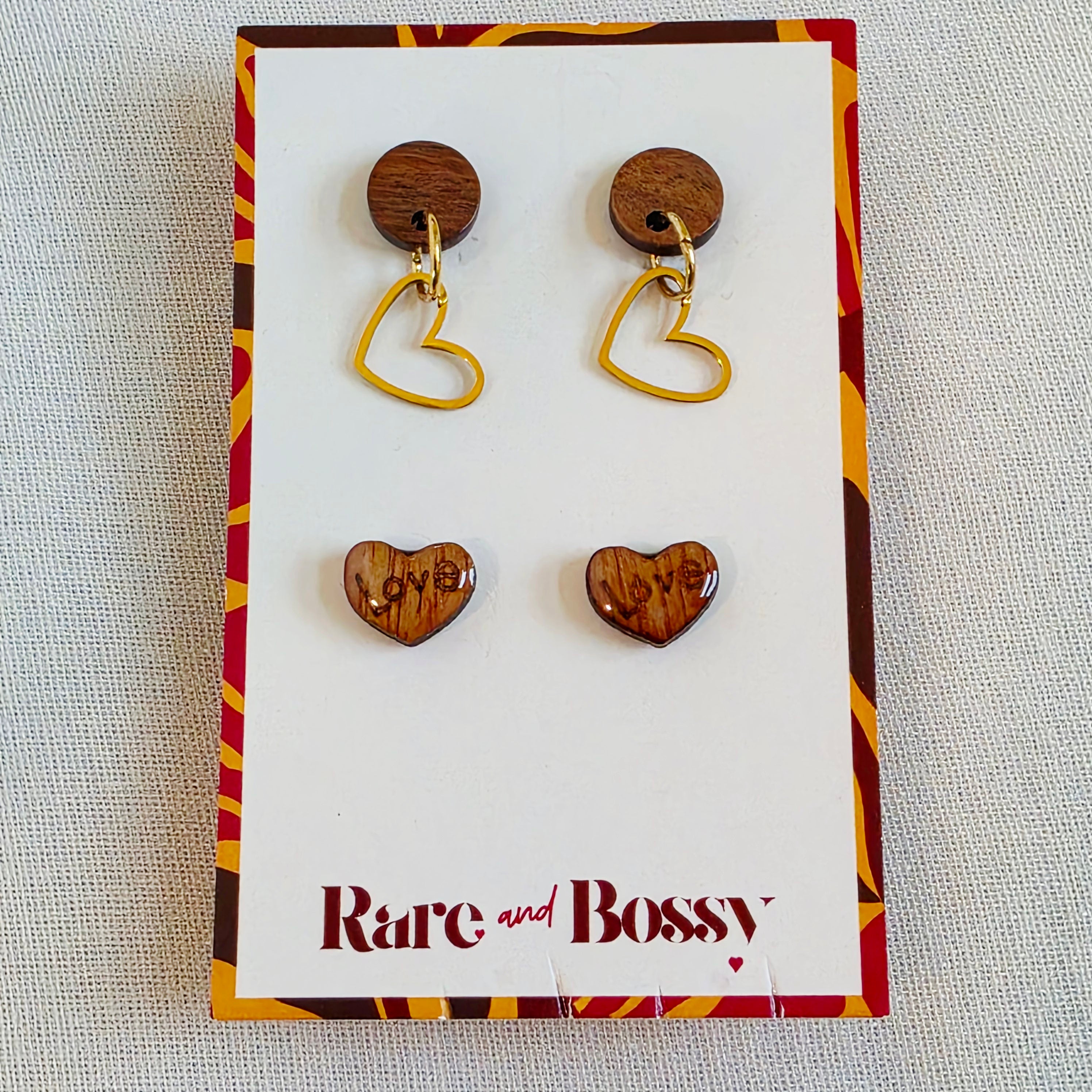 statement. Designed to express both softness and strength, this wood and resin earring duo